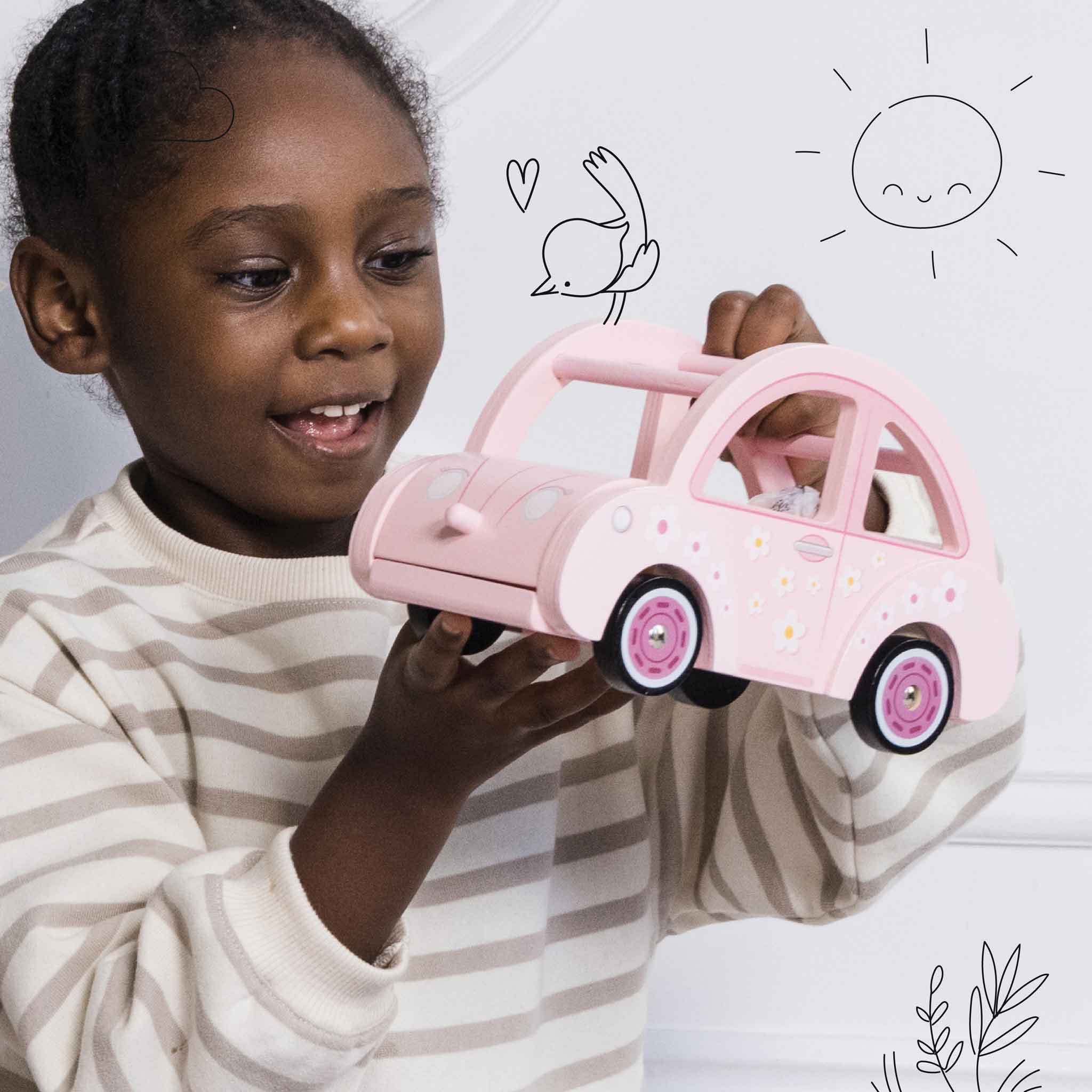 A pretty pink wooden car scaled for Le Toy Van dolls. Includes stylish matching luggage! Dolls are not included.